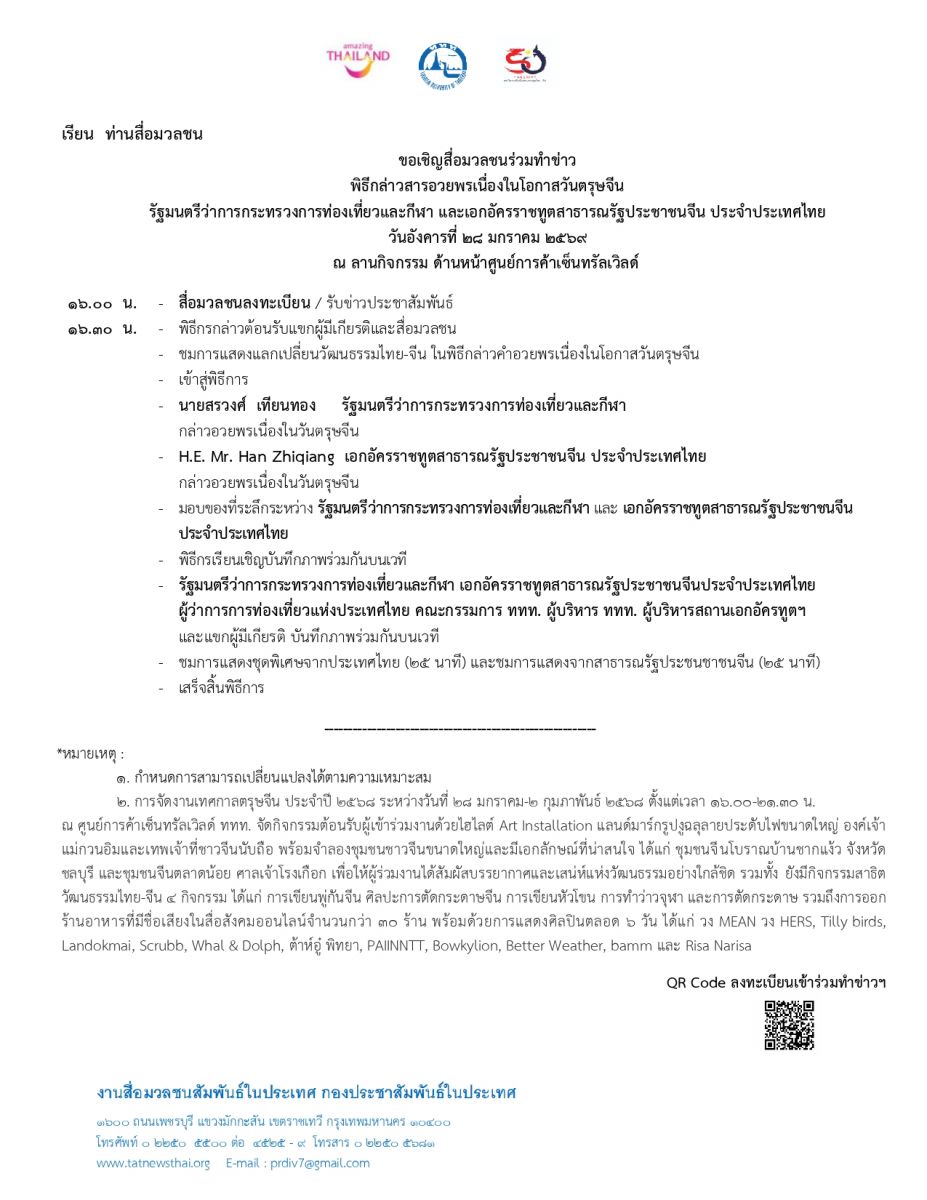 ขอเชิญสื่อมวลชนร่วมทำข่าวพิธีกล่าวสารอวยพรเนื่องในโอกาสวันตรุษจีน รัฐมนตรีว่าการกระทรวงการท่องเที่ยวและกีฬา และเอกอัครราชทูตสาธารณรัฐประชาชนจีน ประจำประเทศไทย ณ ลานกิจกรรม บริเวณด้านหน้าศูนย์การค้าเซ็นทรัลเวิลด์ ในวันอังคารที่ 28 ม.ค. 2568 เวลา 16.00