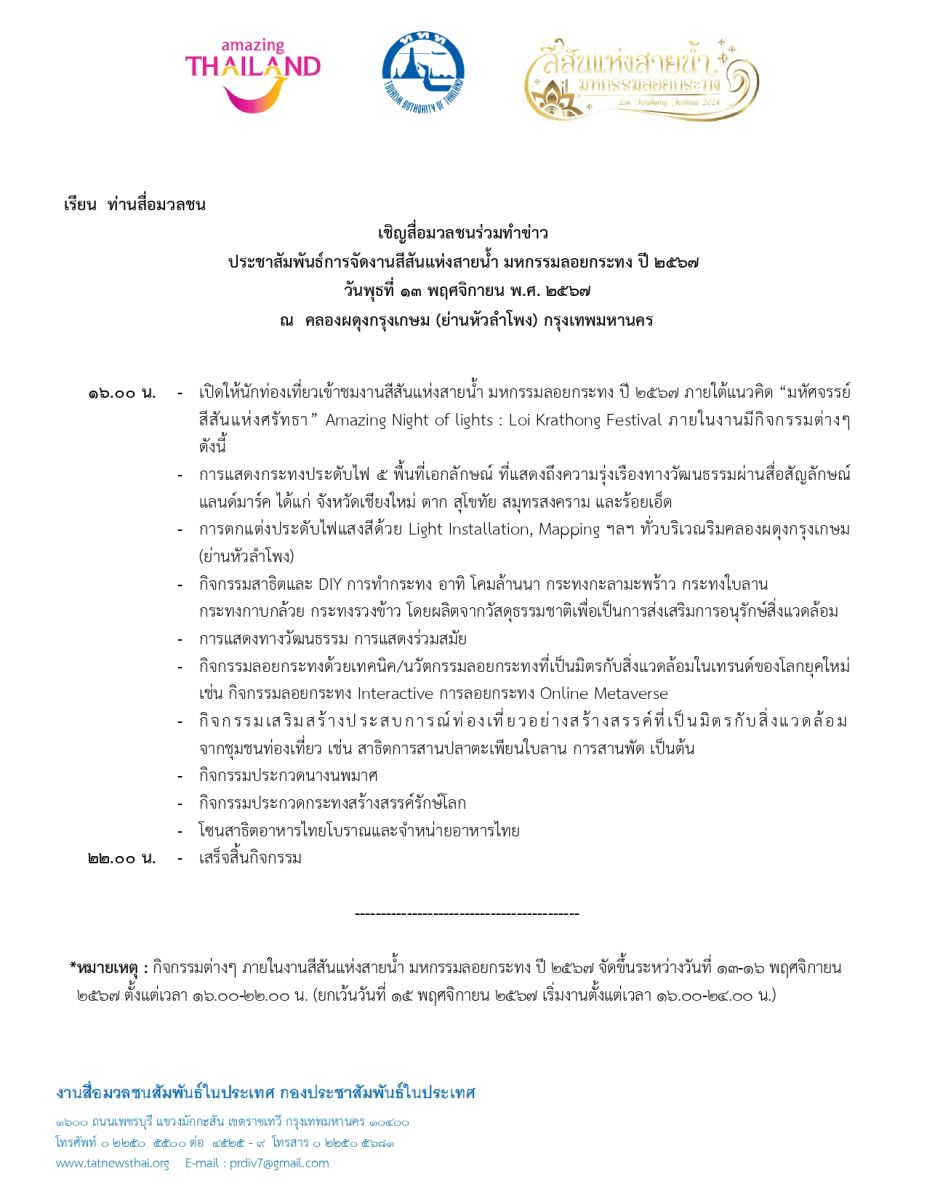 *หมายเหตุ : สื่อมวลชนสามารถลงทะเบียนเข้าร่วมงานล่วงหน้าได้ตามลิ้งค์ https://eform.tourismthailand.org/public/prdiv7-13-11-2567-loi-krathong-festival