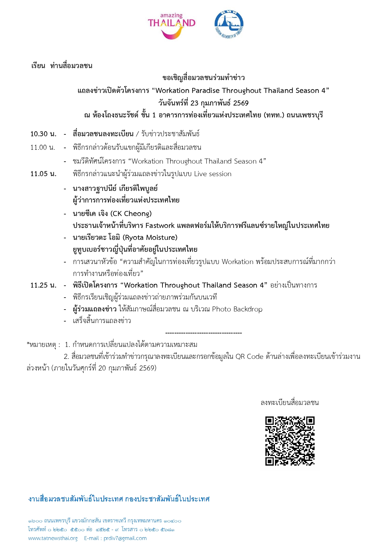ขอเชิญสื่อมวลชนร่วมทำข่าวแถลงข่าวแถลงข่าวเปิดตัวโครงการ “Workation Paradise Throughout Thailand Season 4” ณ ห้องโถงธนะรัชต์ ชั้น 1 อาคารการท่องเที่ยวแห่งประเทศไทย ถนนเพชรบุรีตัดใหม่