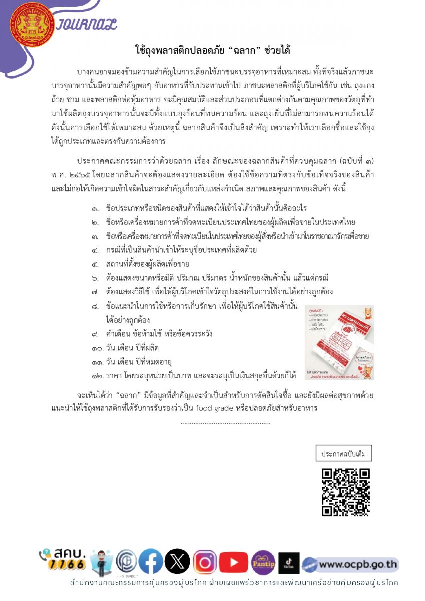 1) เรื่อง ใช้ถุงพลาสติกปลอดภัย “ฉลาก” ช่วยได้